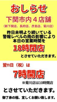 下関市内4店舗営業時間変更のおしらせ