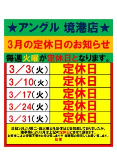 3月の当店の営業時間と定休日のお知らせです。