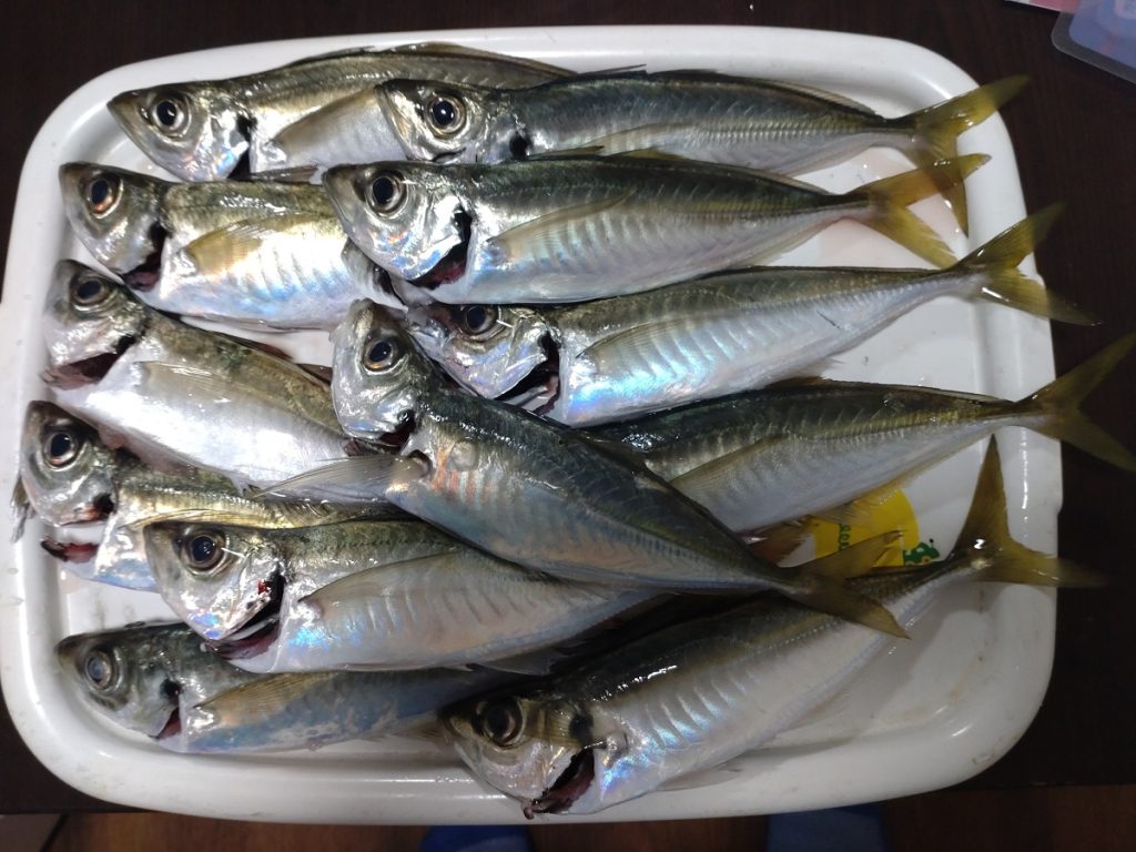アングル彦島店の情報で、ナイターのアジングで好釣果が出ていたので、岬之町で竿出しです。マキエをするとサバ、イワシの群れが回ってきました。本命のアジは若干深めの棚で1本半から1.75本を狙うと型の良いアジが釣れました。
