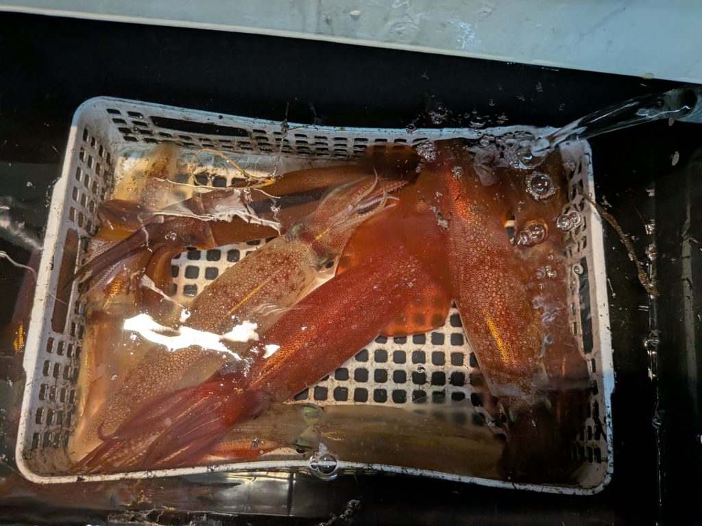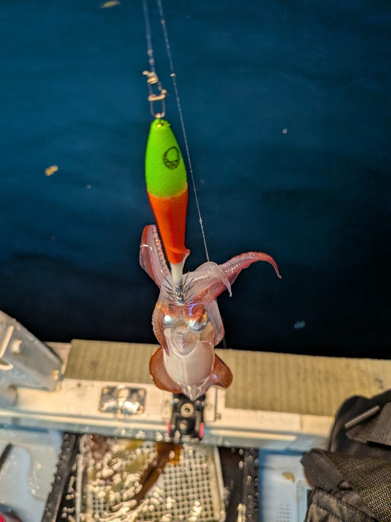 アタリはあるもののなかなかイカが乗らない渋い時間帯が続き、土砂降りになって凍える時間帯もありましたが、その分イカがくるパターン(この日は大きく上げて止める)を見つけた時の喜びはひとしおでした。渋い1日でしたが、周りには大剣を上げている方もいらっしゃいました。やっぱりイカメタルは楽しいですね。