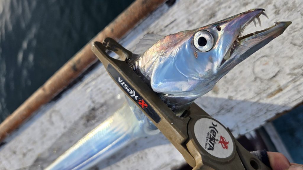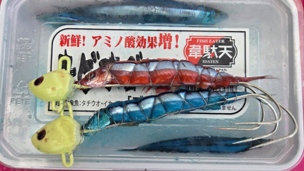 - セフィアXチューンB606MH-S、バルケッタ151DHHG(イカメタルタックル)、 PE0.8号、リーダーフロロカーボン6号、 ヤマシタ:猛光 太刀魚テンヤ8号、6号、エサ:イワシ、キビナゴブルー、キビナゴレッド、