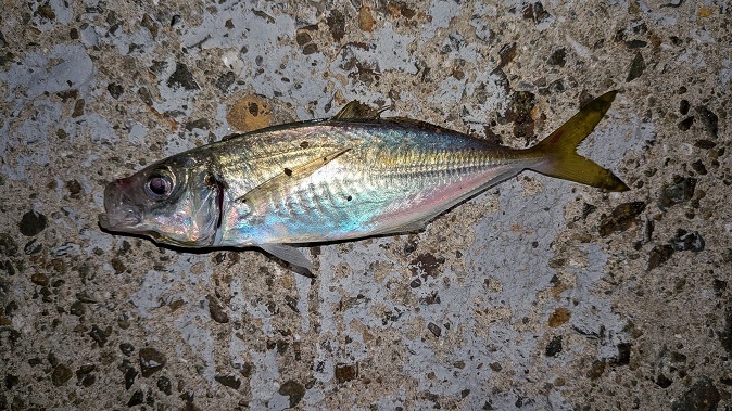 今回は暗くなった時間からアジングに行きました。一投めからカウント5の浅いレンジでもアタリがあるものの、急に冷え込んだせいか食い込みが浅いようで、なかなか針掛りしません。ポイントを変え、ワームを変え、ジグヘッドをナローゲイプの物に変え、ようやくヒット。色々試しながら、アタリも多く、楽しい時間を過ごしました。一尾だけ持ち帰って食べたら、小さいのに脂がのってて非常に美味しかったですよ。