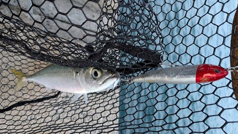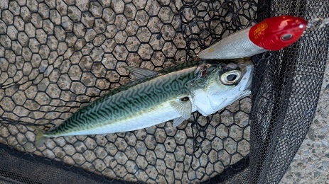 関門でアジ・サバ・イワシがよく釣れているので、それをベイトにしている魚がいないかとプラグを投げに行ってみました。140mmのミノーを投げていると何かアタリが。はい、サバでした。その後トップウォータープラグに替えて投げると、暗くなるまでの間、2投に1回はサバが食ってきました。夕マズメ、暗くなりはじめてから1時間ぐらいの間はサバの活性が高くなるようです。
