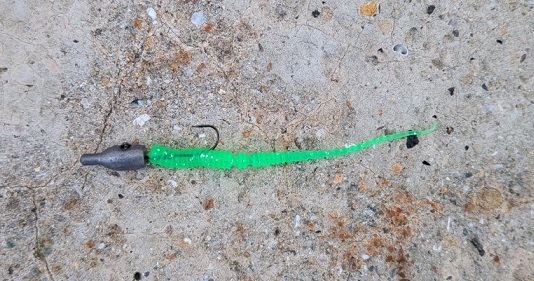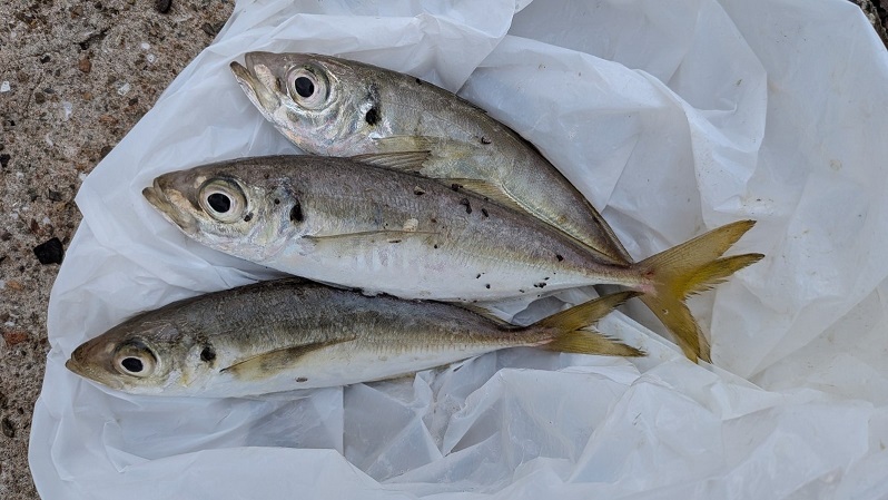 前日食べたアジの美味しさが忘れられず、朝早く目が覚めたので、同じポイントを攻めに行ってみました。周囲は明るくなっているものの、アジの活性は高いようでした。ソリッドグリーンに反応が良く、暗い時間帯とは違ったカラーも必要ですね。この日も美味しくアジをいただきました。