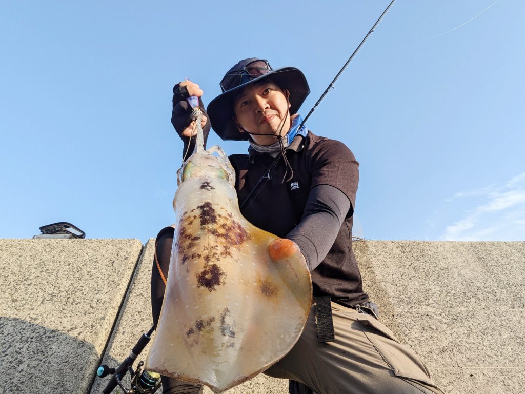 ラインがモゾッと動く違和感に近いようなアタリを捉え上がって来たのは1.1kgのアオリイカ!